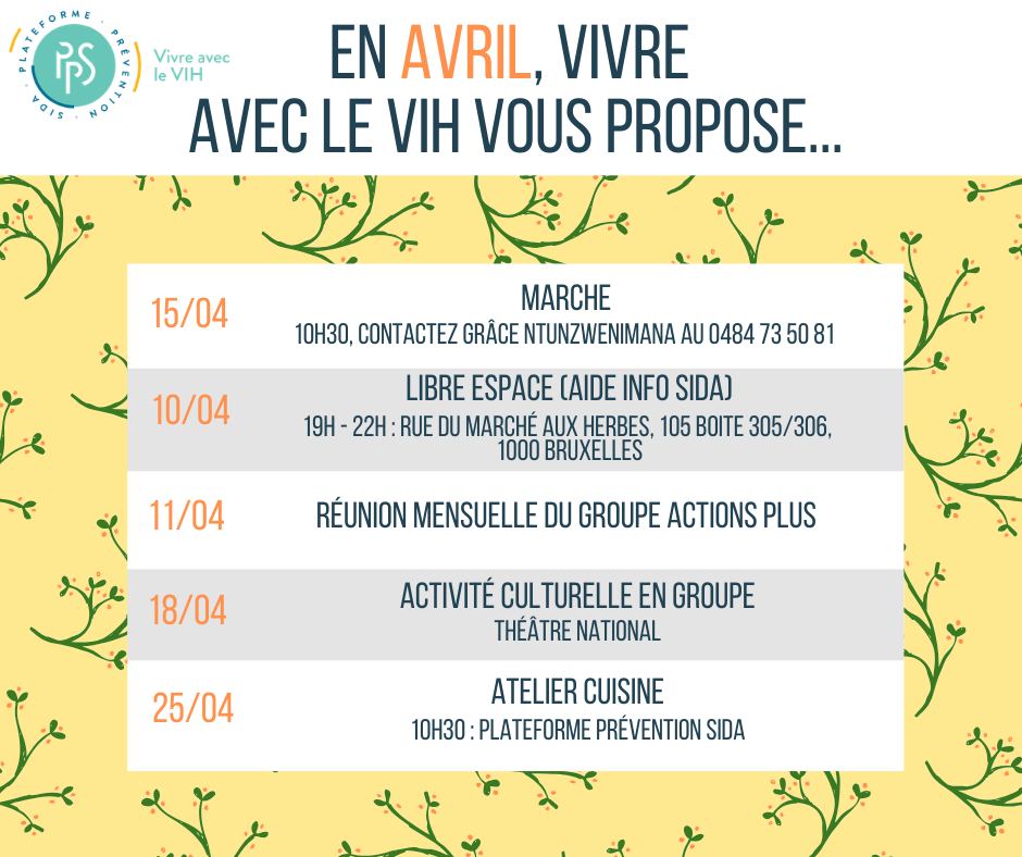 Pour en savoir plus sur les activités du groupe Mandela https://www.vivreaveclevih.org/fr/activites/lespace-mandela/, Actions Plus 💪 https://www.vivreaveclevih.org/fr/activites/actions-plus/ et le Libre espace https://www.aideinfosida.be/